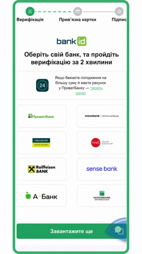 Ідентифікація через сервіс BankID АТ КБ ПриватБанк підвищує ймовірність отримання більшої суми кредиту. Якщо у Вас є картка АТ КБ «ПриватБанк», радимо обрати саме цей спосіб підтвердження відомостей щодо Вашої особи — він безпечний, швидкий і дозволяє системі точніше оцінити Вашу заявку, що збільшує шанси на позитивне рішення.