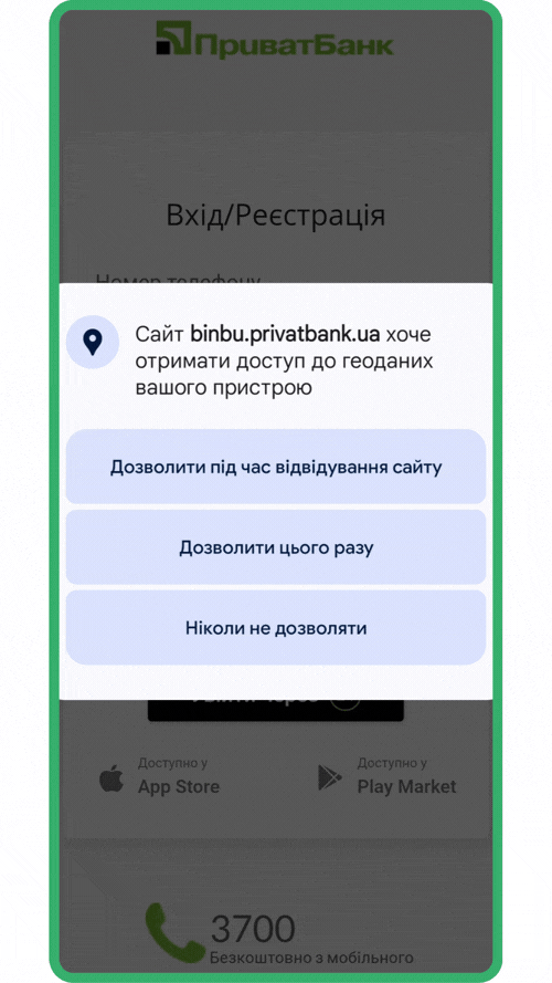 Надайте банку дозвіл на визначення Вашої геолокації.