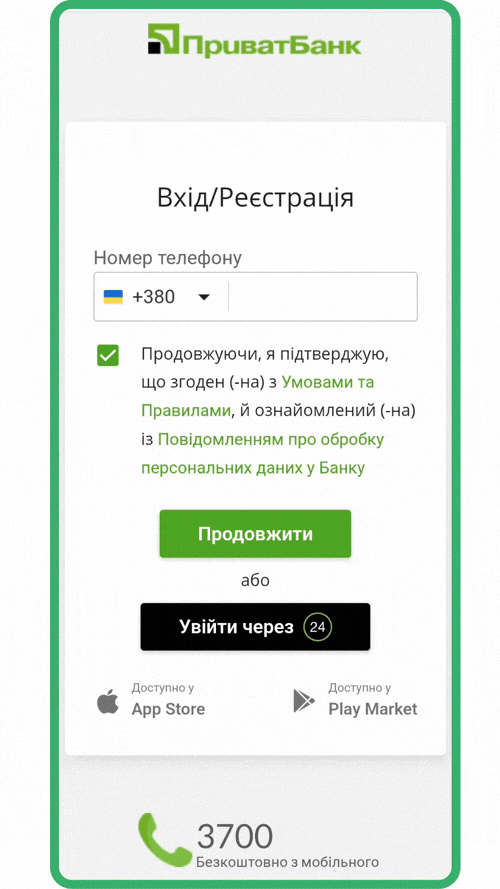 Введіть свої дані (номер і пароль) для авторизації на сайті або в мобільному застосунку Вашого банку. Всі операції Ви проводите на САЙТІ БАНКУ, наша компанія не отримує жодних Ваших персональних даних.