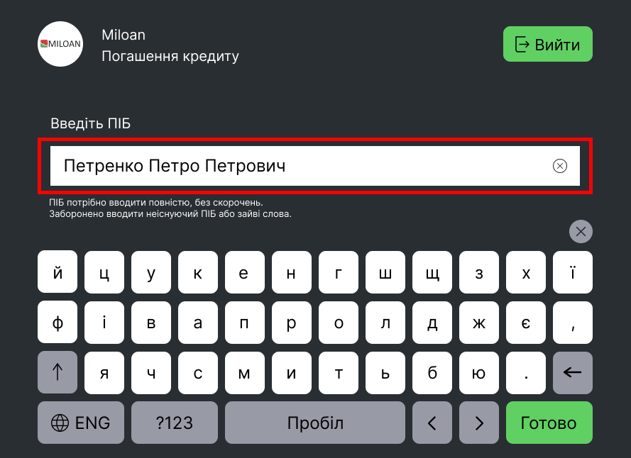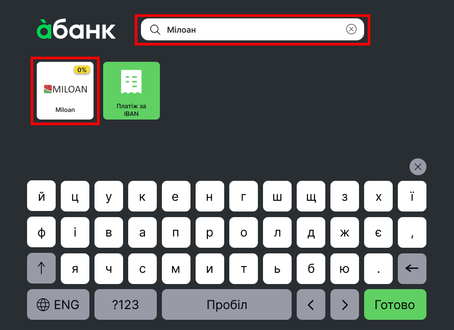 2 В пошуковій строці введіть "Мілоан" та оберіть його зі списку.