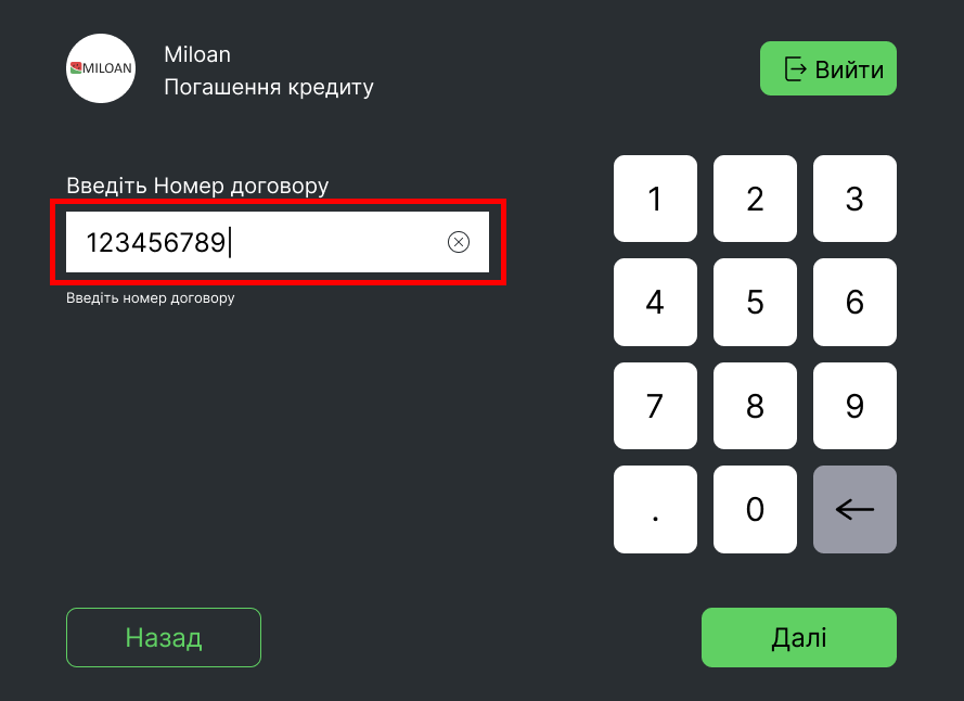 3 Введіть номер договору (5-7 цифр) і натисніть кнопку "Далі".