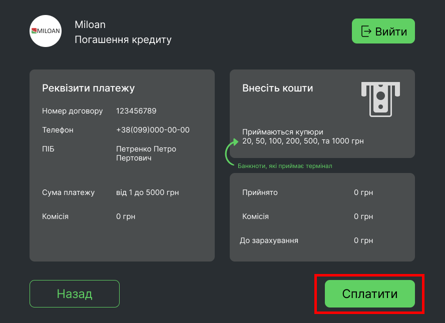 6 Внесіть купюри до термінала. Мінімальна сума 20 грн.